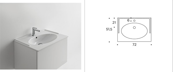 MELODY 72 Console washbasin in ceramic H 1.5. Hole for overflow and upstand on 3 sides.
