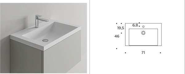 OLLY 71 Console washbasin in mineralguss / tekno H 4.5. Use with plug 5698/99/96. Application for washbasin units W 70 x D 45 cm Total dimensions: W 71 x D 46 x H 4.5 cm Inner basin size: W 59 x D 34 x H 13.5 cm Weight: 13.2 kg