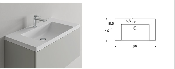 OLLY 86 Console washbasin in mineralguss / tekno H 4.5. Use with drain 5698/99/96. Application for washbasin units W. 85 x D. 45 cm Total dimensions: W. 86 x D. 46 x H. 4.5 cm Inner basin size: W. 59 x D. 34 x H. 13.5 cm Weight: 15.6 kg