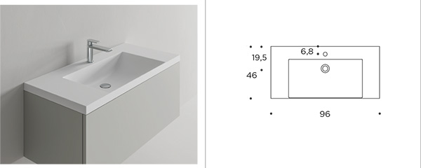 OLLY 96 Console washbasin in mineralguss / tekno H 4.5. Use with drain 5698/99/96. Application for washbasin units W. 95 x D. 45 cm Total dimensions: W. 96 x D. 46 x H. 4.5 cm Inner basin size: W. 69 x D. 34 x H. 13.5 cm WEIGHT: 17.2 kg