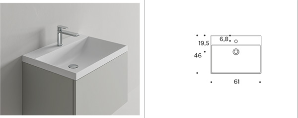 OLLY 61 Console washbasin in mineralguss / tekno H 4.5. Use with plug 5698/99/96. Application for washbasin units W 60 x D 45 cm Total dimensions: W 61 x D 46 x H 4.5 cm Inner basin size: W 59 x D 34 x H 13.5 cm Weight: 11.6 kg