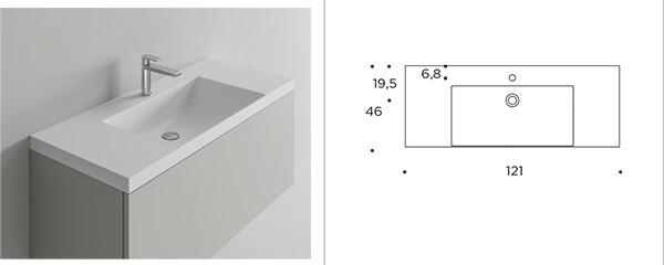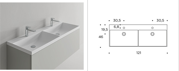 OLLY 121 DOUBLE Console washbasin in mineralguss / tekno H 4.5. Use with drain 5698/99/96. Application for washbasin units W. 120 x D. 45 cm Total dimensions: W. 121 x D. 46 x H. 4.5 cm Inner basin size: W. 59 x D. 34 x H. 13.5 cm WEIGHT: 22.3 kg