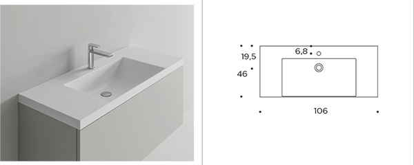 OLLY 106 Console washbasin in mineralguss / tekno H 4.5. Use with drain 5698/99/96. Application for washbasin units W. 105 x D. 45 cm Total dimensions: W. 106 x D. 46 x H. 4.5 cm Inner basin size: W. 69 x D. 34 x H. 13.5 cm Weight: 18.8 kg
