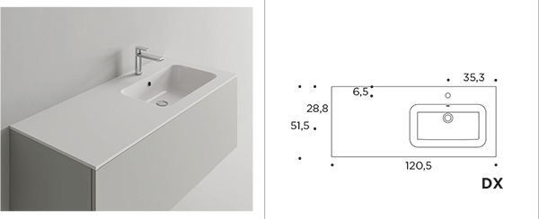 SUGAR 121 RIGHT-LEFT Console washbasin in mineralguss H 1.2. Overflow hole.