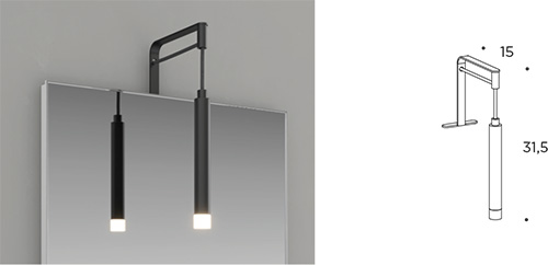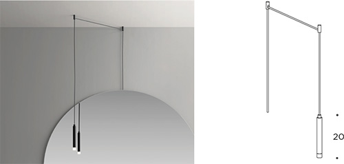 Pendant spotlight with LED light W. 2.5 x H. 20 cm. Includes two ceiling supports and cable W. 3 m. (complete with separate power supply). Finish nero.