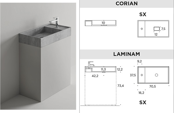 MANTRA MINI washbasin right-left H 12.2 countertop with tap hole W 70.5 x D 37.5 x H 12.2 cm (weight GRES/LAMINAM: 17 kg weight CORIAN: 14 kg)