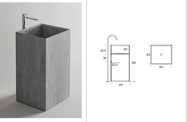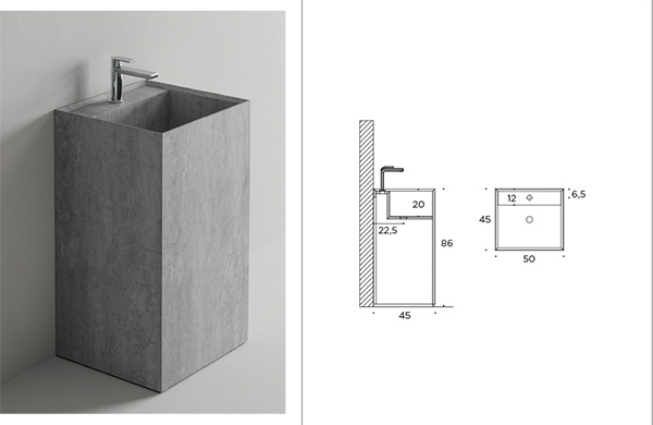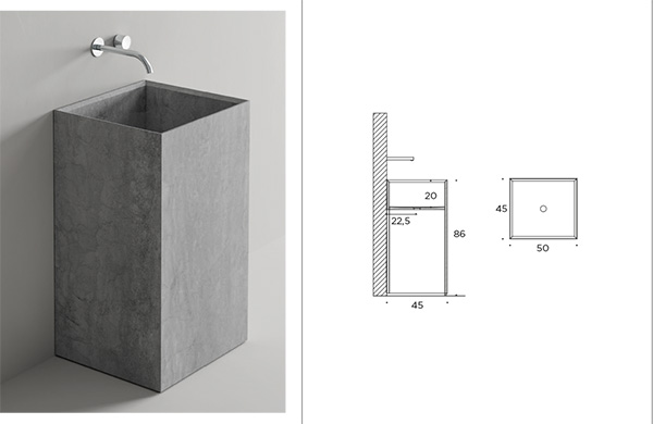 ZEN floor-standing washbasin WALL-MOUNTED for wall tap W 50 x D 45 x H 86 cm (weight GRES/LAMINAM: 45 kg)