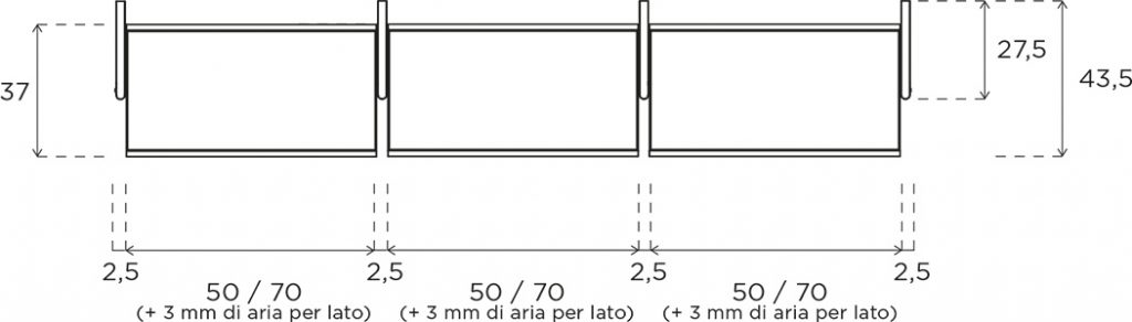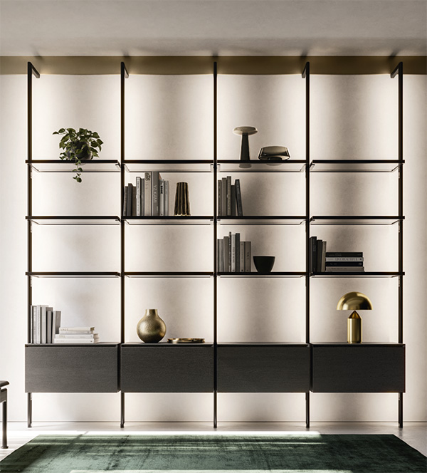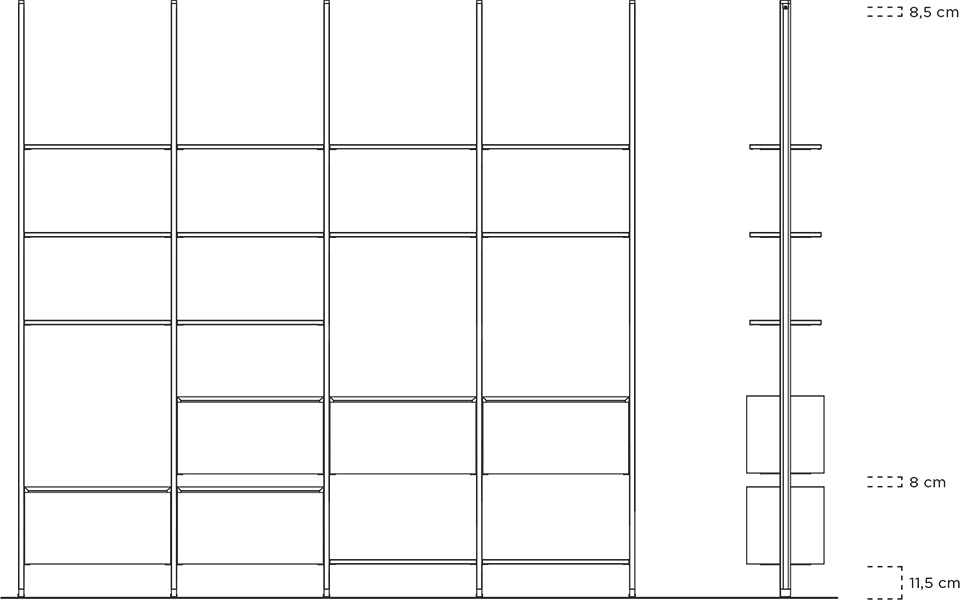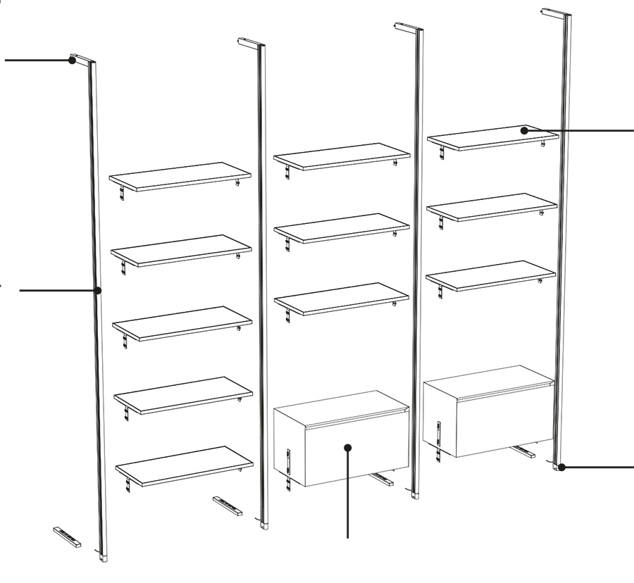 > UPRIGHTS:black aluminum uprights, section W2.5 x D 5 cm withadjustable foot (2 cm) in the lower part and fixing to thewall or to the ceiling.> SHELVES:in transparent grey glass with black aluminum frame 2cm Th.Fixing supports included.> LIGHTING:Uprights also available with 3000K LED light integratedinto the rear part.> CASES:Join base units with drawer (SKY, STREET and DECORmodels), and folding drawer base units CODE in dimensionsW 50-70 x H 36.8 x D 37 cm. Back and bottom alwaysfinished. Fixing supports included..