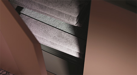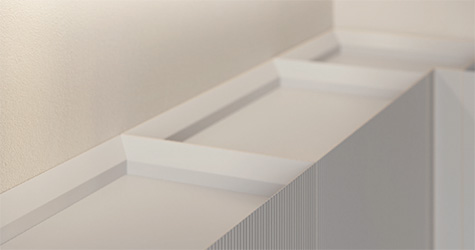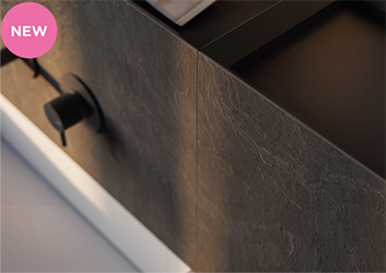 The elements of the Over model can be covered in 5 shades of Laminam thin 2. Specifically, we cover the compositions on the front and on the infill side panels of the composition. The dimensions of the composition therefore increase by 2.5 mm on each side and by 2.5 mm in depth. The processing of the slab between the door and the side is very refined, with a 45° shaping, a standout feature of the entire Over model.