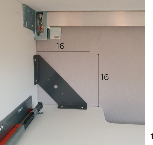 Photo 1: in the washbasin units with a height of 36.8 cm and higher, the bottom panel is always whole. It is possible to use the hole present in the corner bracket for additional wall mounting.