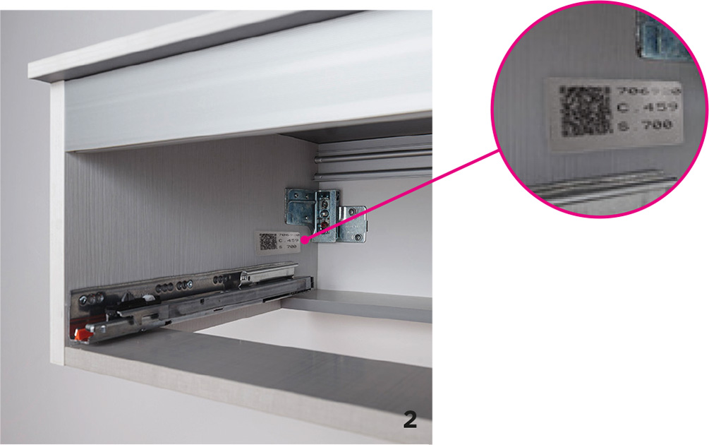 In the Almond, Code, Absolute, Master, and Luxor models, the elements with drawers have Legrabox internal sides in grey metal. All sides include the Blumotion closing system. This mechanism allows for the gentle pull and closure of the drawer, preventing abrupt closures.