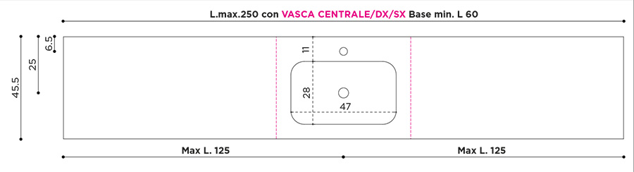 Max. W. 250 with CENTRAL/LHS/RHS BASIN Base unit min. W. 60