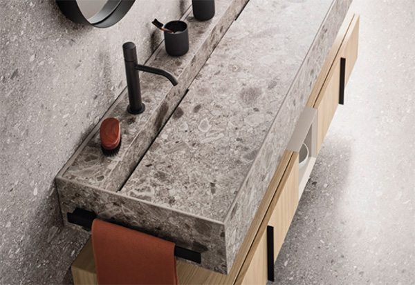 On UNIQUE tops from W 141 to W 170 cm, two tap holes and two rear drains positioned at 1/4 of the total length of the top are provided (for example: on a W 160 top, the tap hole and drain hole will be 40 cm from the edge), unless otherwise specified (always specify the number of tap holes and the number of drains required).