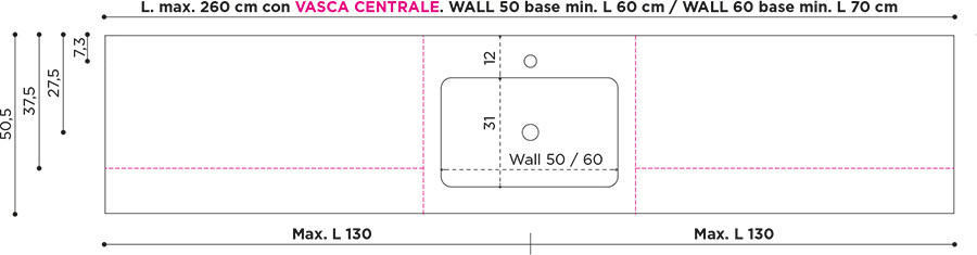 WALL 50for washbasin unitsmin. W. 60 x D. 50 cm (1.2 cm thick)min. W. 70 x D. 50 cm (8 and 14 cm thick)(install with plug item 5698/ 99/96 inTekno Bianco or colour)