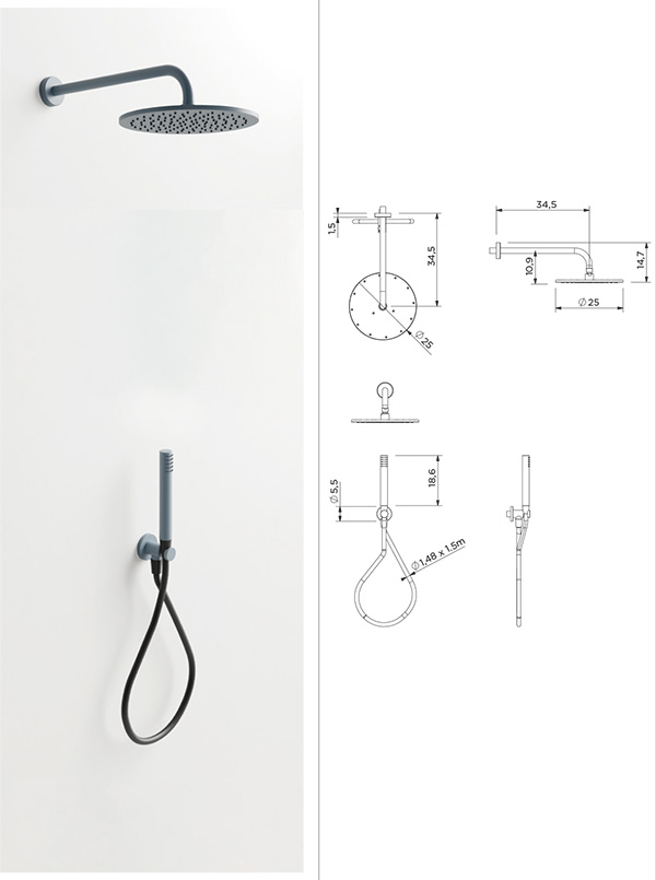 Shower kit with rain showerhead Ø 25 cm thickness 0.8 cm, wall arm and water intake kit recommended with built-in group G007
