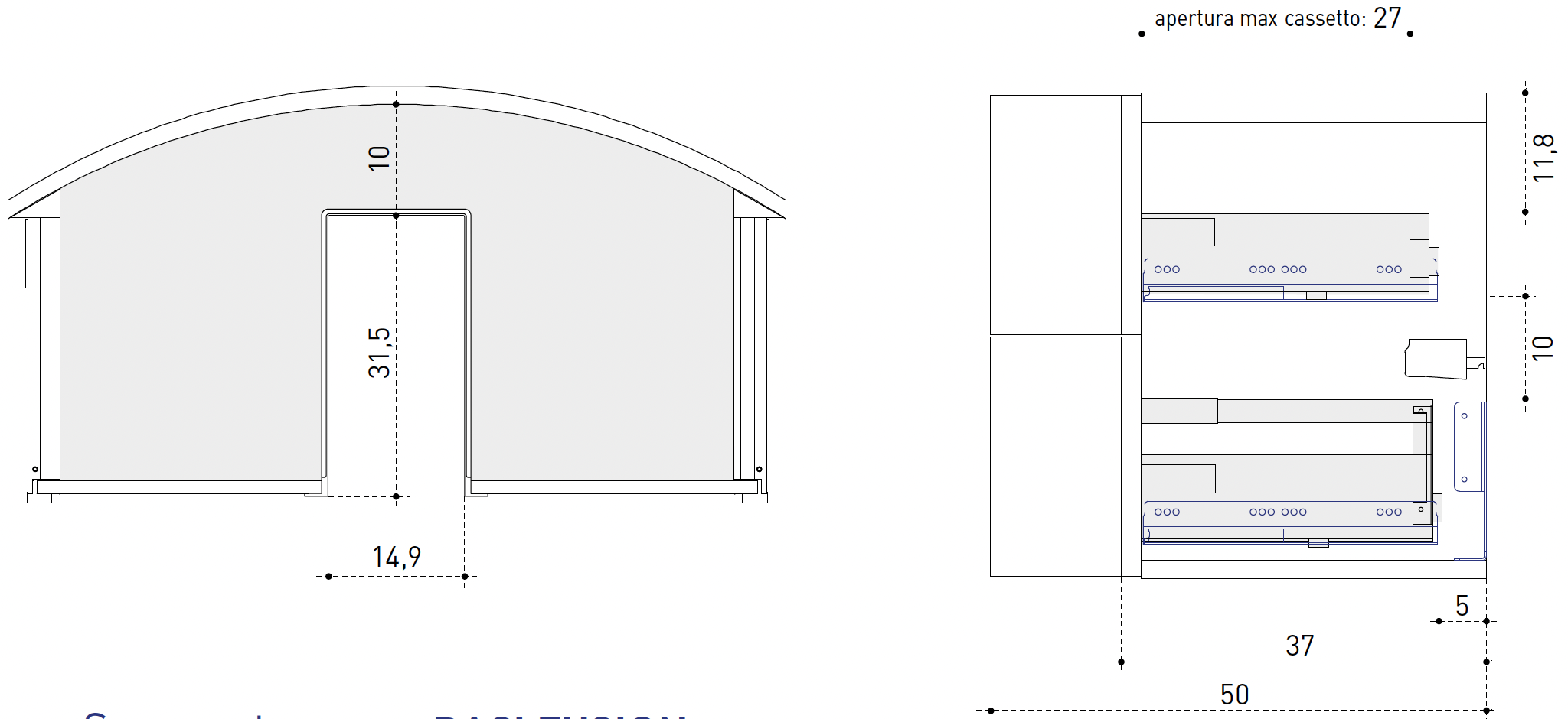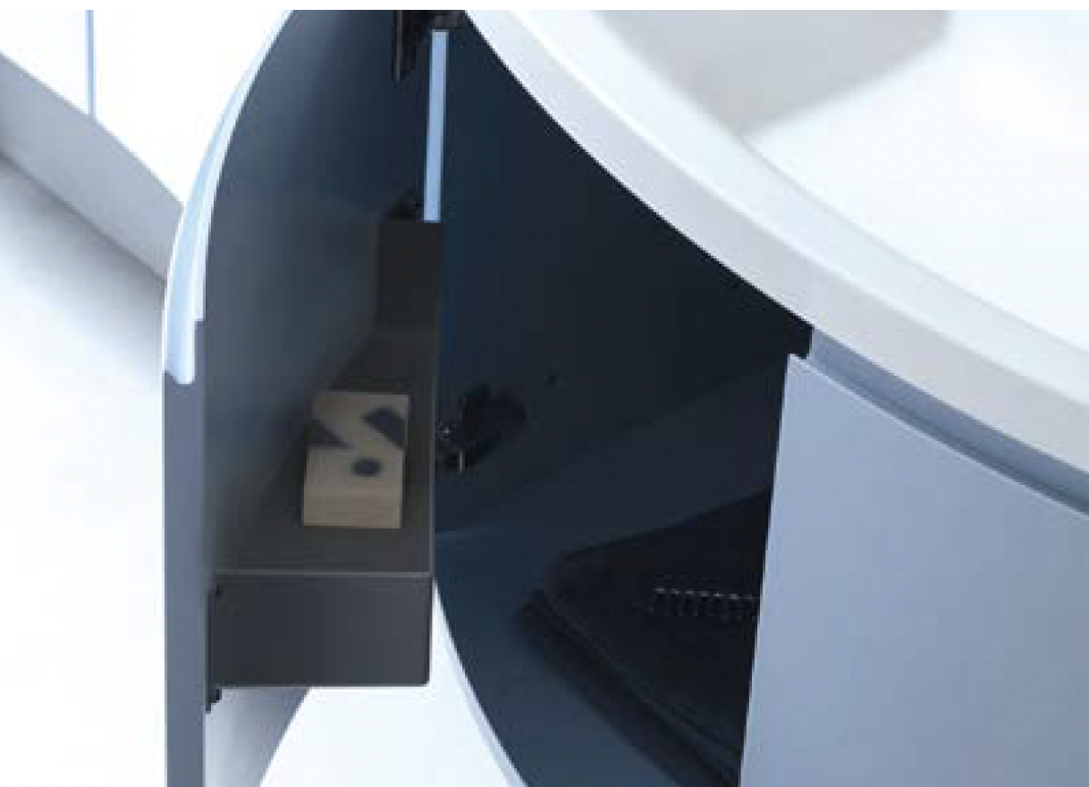 For the FUSION washbasin units with shaped drawer, the standard shaping for curved base is used. (see drawing).