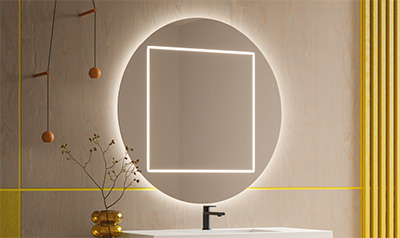 Pitagora mirror with square sandblasting, backlit with 3000 K LED light and 3000 K perimeter LED light. |