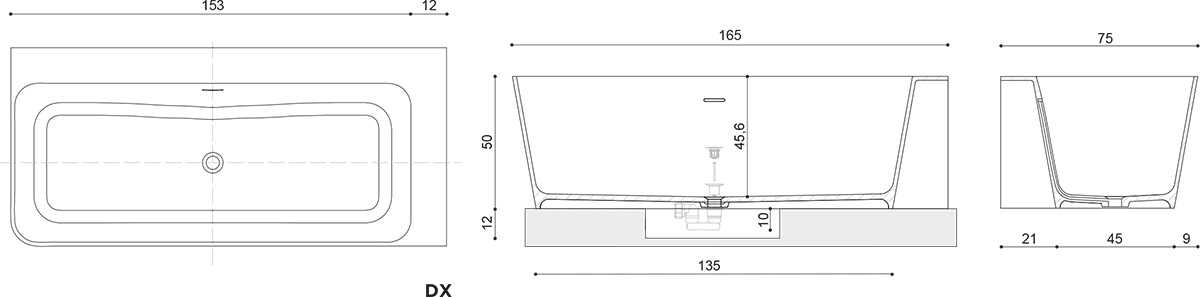 R00C | Bathtub SARA right-left W. 165 x D 75 x H 50 cm with bianco plug included (or color on bathtub in tekno all color) Stop & Go and siphon kit (with integrated overflow) | Water capacity: 243 liters Weight: 105.8 kg |