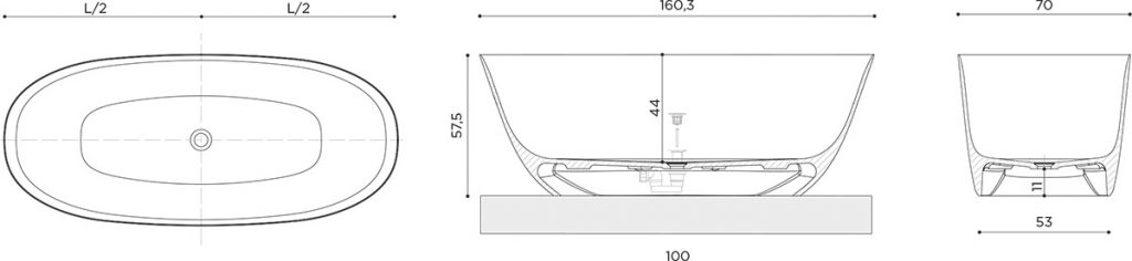 A888 | Bathtub SOLAR W. 160.3 x D 70 x H 57.5 cm with bianco plug included or color on bathtub in tekno all color) Stop & Go and siphon kit (without overflow) | Water capacity: 313 liters Weight: 101 kg |