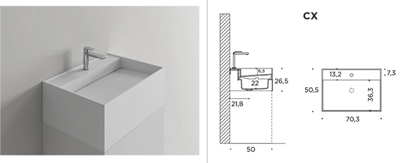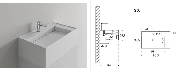 | GURU 85 right-left H 26.5 cm with tap hole and removable slide. L 85.3 x D 50.5 x H 26.5 cm (weight: 18 kg + 1 kg for slide) | AA12 |