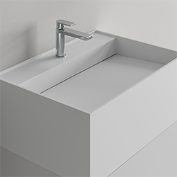 Mineralguss is a composite material in which the internal mass, made from a combination of a natural mineral and polyester resin, serves as a support for the surface film. Therefore, it is not a plastic material, but rather an elegant mineral compound to the touch, hygienic and suitable for bathroom and public space furnishings. The gelcoat film that covers the surface of the material provides excellent resistance from both a physical and, above all, chemical standpoint. Mineralguss is a highly ductile material, resistant to humid heat, cigarette burns, and dry heat.