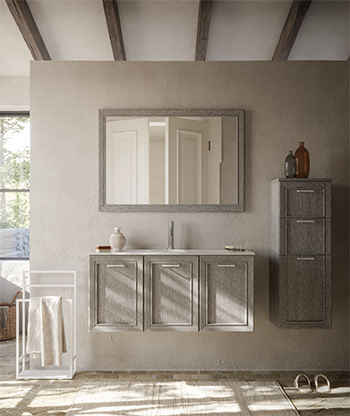 oak veneered fiberboard panels; bianco or color in 51 matt shades and 4 metal, pastel oak in the finishes Amour, Etoile, Sable, Marine, and Opaline, and decapè oak in the finishes Polvere, Felce, and Menta.