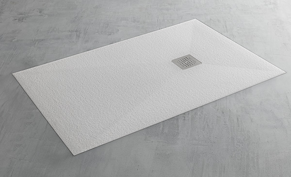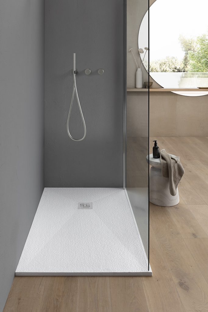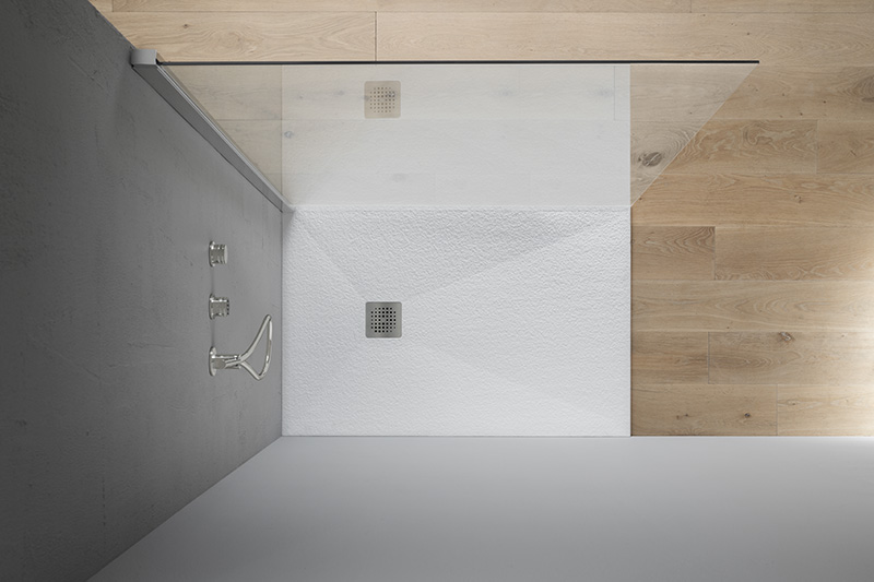 FEEL > MINERALSOLID > 2,5 cm β’Technical sheetβ’PRICE LISTβ’Cuts tagli cuts dΓ©coupes Shower tray installation resting on the floor with textured edges Shower tray installation at floor-level